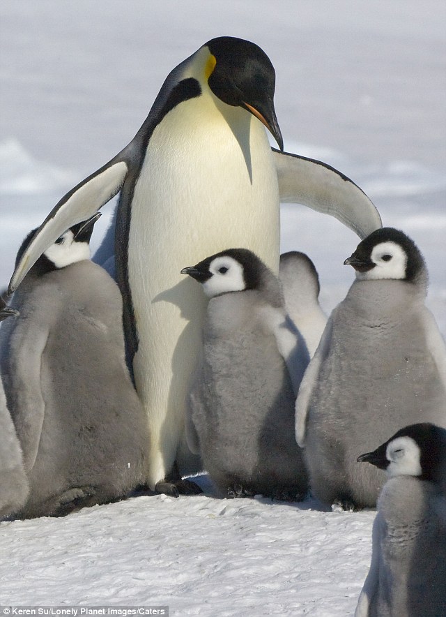 I'll keep you warm: A penguin keeps her young close in the frozen wastes of Antarctica